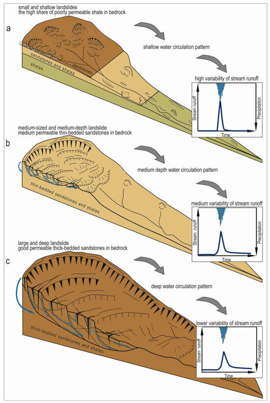 The very low water storage capacity of the landslide-affected catchment in the Pasmo Lubonia Range (PL-L) is not only due to the high share of poorly permeable shale in the lithology [48,54], but also due to the nature of local landslides. In the upper sandstone part of the PL-L catchment, there are several relatively small (up to 0.07 km2) and shallow (up to a dozen or so meters in depth) landslides [43,44,45]. Shallow landslide depths indicate the shallow occurrence of poorly permeable shale in bedrock, which forms the landslide sliding surface. The shallow depth of landslides is also associated with the shallow depth of various types of fractures, which play an important role in water circulation in landslide areas [31,55,56]. The system of shallow fractures provides an efficient pathway for the drainage of rainwater and meltwater into the landslide [30,57]. Hence, the system of shallow fractures together with a shallow occurrence of poorly permeable shale result in a shallow, and therefore rapid, water circulation pattern in PL-L catchments (Figure 13a). According to Hale et al. [58], Hale and McDonnell [59], Pfister et al. [60], and Burt et al. [61], water transit times decrease with an increase in the share of impermeable bedrock in catchments. Furthermore, the rapid hydrologic response of the landslide-affected PL-L catchment to snowmelt and rainfall indicates good hydraulic contact between fissures—according to Krzeminska et al. [31], a connected network of fissures in the landslide body results in fast preferential drainage, referred to as preferential fissure flow [55].