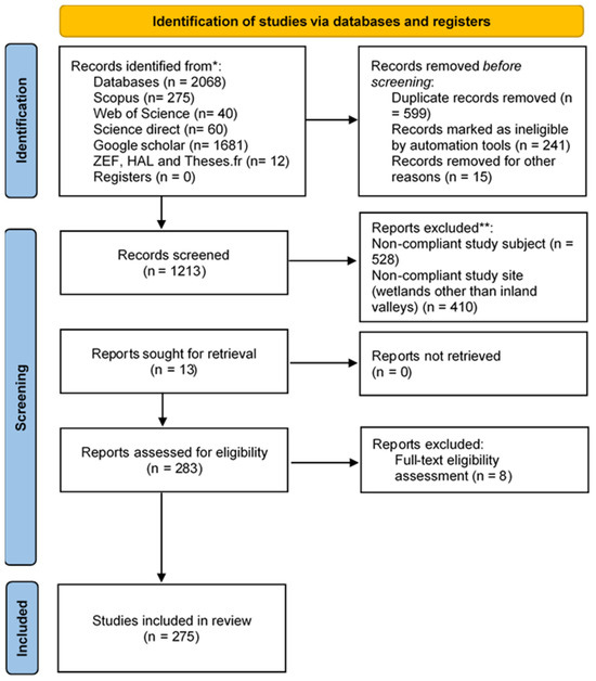 To ensure the relevance of the search results, a screening process was conducted to exclude duplicate documents. The remaining documents were then verified based on their titles and abstracts, with those deemed outside the scope of the study being excluded. Only documents written in French and English were considered for this study. In addition to scientific documentation, grey literature sources were explored, including project reports and existing documentation from various non-governmental organizations (NGOs) involved in inland valley management. This grey literature served as a valuable resource and supported the analysis and discussion in this study.