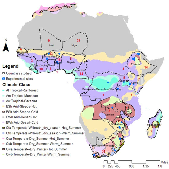 Distribution of studies on hydrological issues in inland valleys areas in Africa. Red numbers are the number of studies per country and blue dots represent experimental sites used for quantitative synthesis. In background, the climate map according the Köppen classsification.