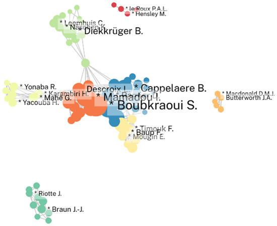 Network of collaborations between researchers working on the hydrological functioning of inland valleys; ‘*’ refers to the name of the most important collaborator of the cluster.