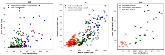 To determine driving factors of hydrological responses in inland valleys, we firstly analyze rainfall–runoff relations by applying the clustering Kmeans method to datasets of different scales. We relied on the silhouette coefficient to identify the optimal number of clusters for each dataset. This exploratory analysis revealed a good correlation between rainfall and runoff at all scales: R2 = 0.50, 0.80, and 0.76, respectively, for event, annual, and multi-year scales. Classes of similarities emerge along the rainfall gradient (Figure 5). The observed classes can be synthesized into three main categories: low, intermediate, and high rainfall. The limited dataset at the event scale does not allow for differentiation of hydrological response between low and intermediate events but remains consistent with the rainfall gradient. By incorporating information about the climatic zone into the obtained clusters, we note a prevalence in high rainfall events (>80 mm) in dry climatic zones. At the annual and multi-year scales, the observed clusters align nearly with the climatic groups (dry, tropical, and temperate). Low annual rainfall is observed in dry regions, while intermediate and high annual rainfall are aligned with tropical and temperate zones.