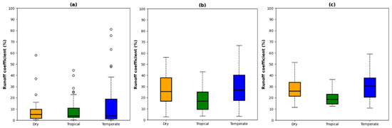 Runoff coefficients according to time and climate scales in inland valleys: (a) at event scale, (b) at annual scale, and (c) at multi-year scale. Circles refer to individual observations.