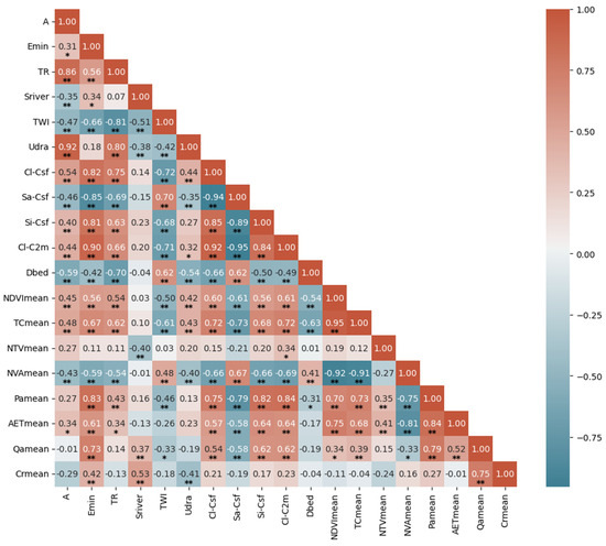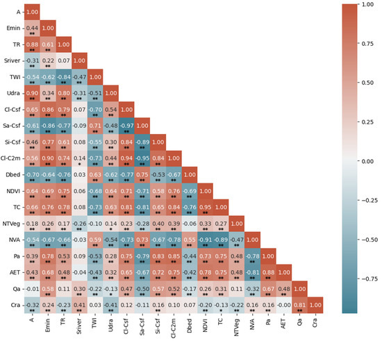 Correlation matrix between physical parameters and hydrological indices in inland valley areas at annual scale. Acronyms means: area (A), minimum elevation (Emin), total relief (TR), slope of flow axis (Sriver), topographic wetness index (TWI), percentage of upstream drainage area (Udra), mean clay content in catchment surface (Cl-Csf), mean sand content in catchment surface (Sa-Csf), mean silt content in catchment surface (Si-Csf), mean clay content in catchment at a depth of 2 m (Cl-C2m), average of absolute depth of bedrock in catchment (Dbed), annual normalized difference vegetation index (NDVI), tree cover (TC), non-tree vegetation area (NTVeg), non-vegetated area (NVA), annual rainfall (Pa), annual actual evapotranspiration (AET), annual total runoff (Qa), and annual total runoff coefficient (Cra). ** p < 0.05, * p < 0.1.
