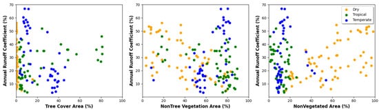Scatter plots of runoff coefficients according to land cover factors in inland valleys at annual scale.