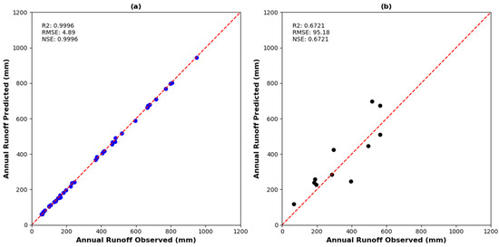 Annual runoff simulations with model based on physical characteristics of inland valleys (a) at calibration and (b) at validation.
