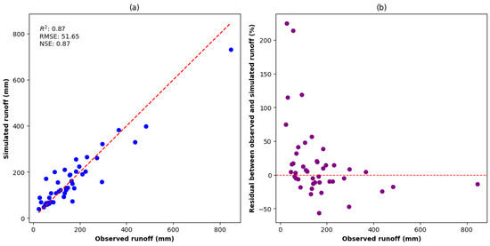 (a) Comparison between observed and simulated discharge at annual scale in inland valleys, (b) residual analysis of observed vs. simulated runoff according to modeling studies in inland valleys.