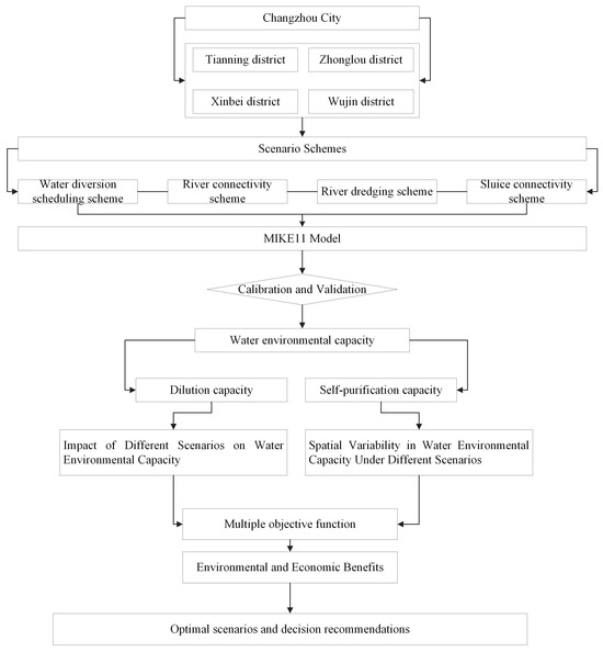 In this study, four administrative districts in Changzhou were selected as the research area. Four water management planning scenarios were established, and a MIKE11 model was developed for each scenario to analyze the variations in water environmental capacity. Finally, a multi-objective decision function was used to identify the planning scheme that achieves the greatest environmental improvement with the lowest economic cost. The specific process is illustrated in Figure 2.