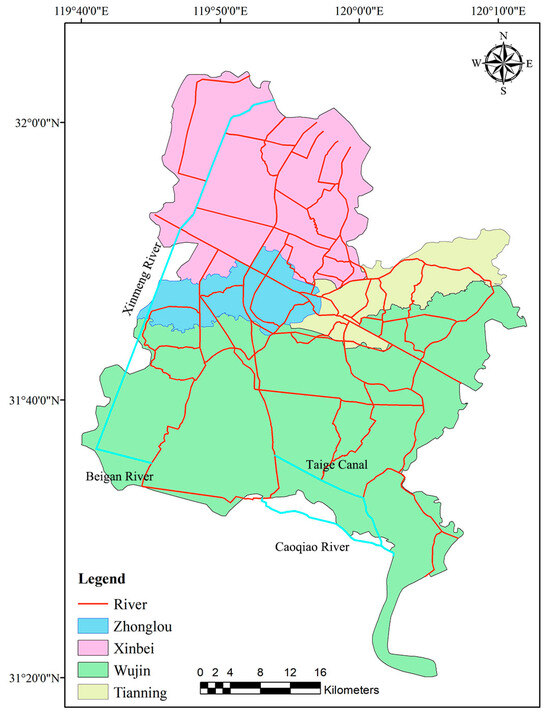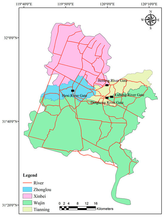 This study focuses on the central urban area of Changzhou, which encompasses the four administrative districts of Tianning, Xinbei, Zhonglou, and Wujin [23,24]. The study area is geographically situated within the coordinates 119°08′–120°12′ longitude and 31°09′–32°04′ latitude and is located in the core region of the Yangtze River Delta. The area is characterized by its advanced economy, dense river network, and complex water management system, making it a representative example of a plain city river network.