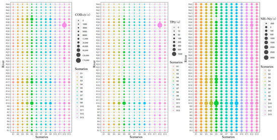 For chemical oxygen demand (CODCr) capacity, as shown in Figure 7, Scenarios 2–9 and 11–13 all lead to a certain degree of improvement in the CODCr capacity of the river network, with the environmental capacity increasing as the upstream water diversion flow increases. Among the various interventions, river-dredging works resulted in the most significant improvement in CODCr capacity. Specifically, the CODCr capacity of the Xinmeng River (R37) increased to 170,000 tons per year (t/a). The Taige River, Caoqiao River, Wujin River, and Yapu River are key rivers that connect the study area’s river network to Taihu Lake. For the Taige River and Caoqiao River, the highest CODCr capacities were achieved in Scenario 12, reaching 18,899 t/a and 32,678 t/a, respectively. For the Wujin River and the Yapu River, the highest CODCr capacities were achieved in Scenario 5, reaching 12,550 t/a and 2319 t/a, respectively.