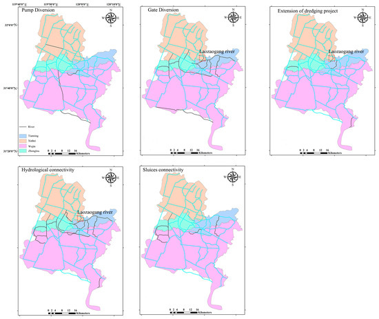 It is important to note that the selection of the four scenarios in this study was based on relevant planning decisions made by the water management authorities of Changzhou. For the city of Changzhou, one of the key measures for improving the river network’s water environment is the River Connectivity and Flow Enhancement Project and the Water Diversion for Environmental Improvement Project. In this study, the Water Diversion Scheduling Scheme and River Dredging Scheme are major components of the Water Diversion for Environmental Improvement Project, while the River Connectivity Scheme and Sluice Connectivity Scheme are key components of the River Connectivity and Flow Enhancement Project. The specific setup of these schemes is described in Section 3.1.