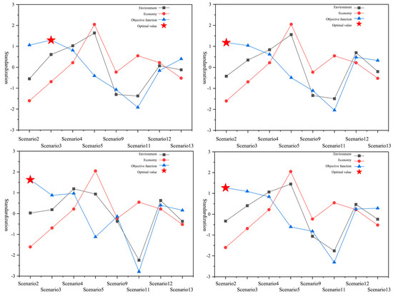 In the formula, y(i) is a multi-objective function, i represents different schemes, Ei is the environmental benefit function, and Mi is the economic cost function. The optimal value of y(i) is the ideal state with the highest environmental benefit and the lowest economic cost. is the average value of environmental benefits, and is the average value of economic costs. In order to facilitate the analysis and comparison of different schemes, the environmental benefits and economic costs of each scheme are standardized without dimensions.