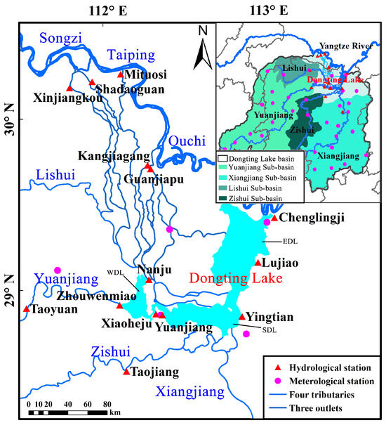 Dongting Lake is the second largest freshwater lake in China and contains three international nature conservation wetlands (EDL, SDL and WDL, 2550.72 km2 in total), and one provincial Heng-ling lake wetland conservation region. The three outfalls (Songzi, Taiping, and Ouchi), which connect the Yangtze River with Dongting Lake together, on average, carry 86 billion m3 of runoff and 110.98 million tons of sediment annually for nearly 70 years from 1955 to 2023. This accounts for about 30.7% of the total runoff and about 80.9% of the total sediment, respectively. The average annual temperature is 16.6–17.6 °C, and the temperature is approximately 4.5 °C in January, and usually higher than 30 °C in July. The average annual precipitation is 1303 mm. There are 11 crucial and 24 general embankments around Dongting Lake to draw off flood water during the flood period.
