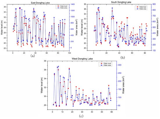 The water area changes with its flexible water levels, and they are usually positively correlated. To verify it, we choose 234 images and calculate the water area by software ArcGIS 10.8, and then put the results about water area and water level data in one coordinate system (see Figure 3a–c for EDL, SDL, and WDL, respectively). From the figure, one can find that water area increases as the water level value becomes large, and vice versa. Hence, there exists a spatial coupling relationship between these two variables.
