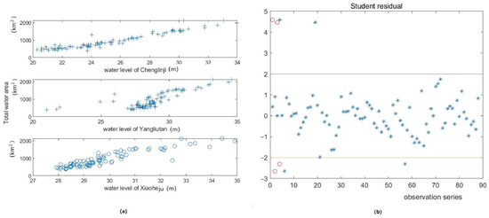 (a) The scatter plots: above (total water area and water level at Chenglinji), middle (total water area and water level at Yangliutan), and bottom (total water area and water level at Xiaoheju). (b) Studentized residual plot.