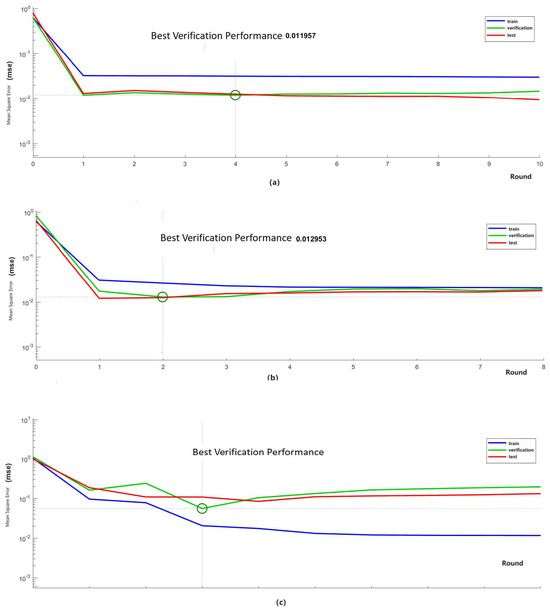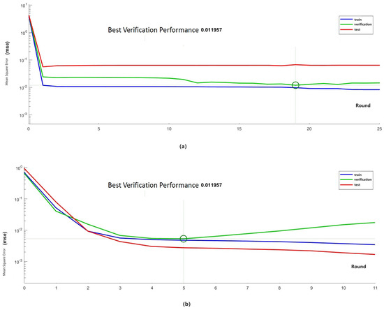 The training, testing, and verifying performance error curves for obtaining total water area: (a) Single variable regression. (b) Multivariable regression.
