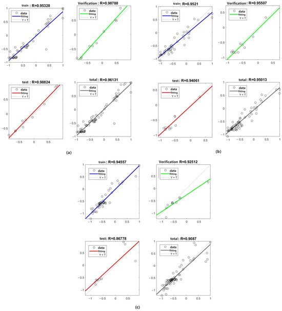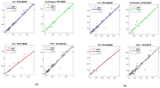 The regression results on total water area are shown as Figure 14a,b, respectively for the machine learning method by single variable regression and multivariable regression. Each includes four sub-figures, respectively, for training, verification, testing and total. They are in agreement, and the better one is the EDL from the coefficient of determination R-square for the total R = 0.9365.