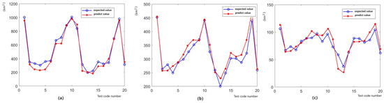 Simultaneously, we also display the relative error comparisons between predicted values and expected values by the machine learning method (Shown as Figure 15), respectively, for total water area in three ways: one linear regression, three linear regressions, and multivariable regression. From this figure, one can find that there exist some errors in the predictions, where some are very small and others are relatively big, which may be due to the complexity of this problem. The best one is the multivariable regression method (the third way), and the worst one is the linear regression method (the second way). These results accord with those in Section 3.1 by polynomial regression methods.