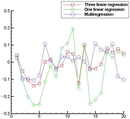 The comparisons of the relative errors for testing data about one linear regression, three linear regressions, and multivariable regression, respectively.