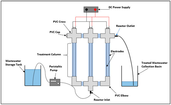 The experimental setup of the EC reactor is depicted schematically in Figure 1. The continuous EC system comprises three vertical treatment columns (Schedule 40 PVC, Acklands Grainger, Mississauga, ON, Canada) with interior diameters and heights of 5.08 cm and 45.75 cm, respectively. Columns are connected using a double sanitary tee and elbow fittings (Schedule 40 PVC, Acklands Grainger, Mississauga, ON, Canada) with 7 cm sections of 5.08 cm inner diameter PVC tubing installed horizontally. The total effective treatment volume is 2.78 L. Treatment columns are each fitted with two aluminum rectangular plate electrodes (grade 6061, measurements: 63 × 2.54 × 0.2 cm, McMaster-Carr, Chicago, IL, USA), which are submerged to 52 cm, giving a total effective area of 132.1 cm2. The electrode separation distance was 3.5 cm. Electrode pairs were wired in monopolar-parallel configuration and connected to a DC power supply (B&K Precision 9111 180W). Continuous flow through the system was provided by a peristaltic pump (Fischerbrand™ Variable-Flow Pump 3), whose speed could be altered to achieve consistent flow between 4 and 600 mL/min. Flow through the system was upwards, with a single inlet supplying water evenly to all treatment columns and a single exit at the top of the unit.