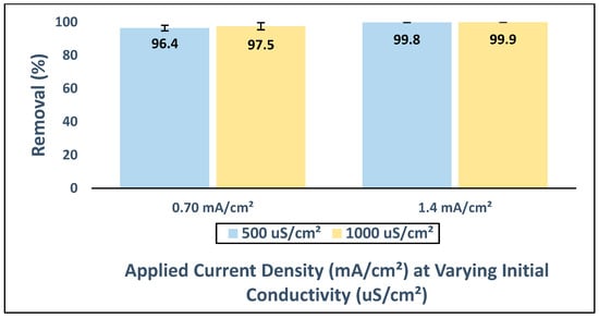 The effect of water conductivity on phosphorus removal efficiency was investigated. To perform the investigation, synthetic wastewater containing 20 mg/L OP and a conductivity of 500 ± 4.59 and 1000 ± 36.7 μS/cm was treated using an HRT of 15 min and current densities of 0.7 and 1.4 mA/cm2. Figure 2 shows the results indicating that the variation of conductivity while maintaining constant current density and HRT appeared to have a negligible effect on OP removal. However, energy consumption was reduced by approximately 60% when using a conductivity of 1000 μS/cm rather than 500 μS/cm, as the current transfer was improved at a higher current density. Based on the data provided in Figure 2, 500 μS/cm was used for the remaining investigations, as this value matched more closely the conductivity of real STE [27].