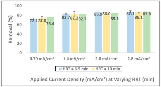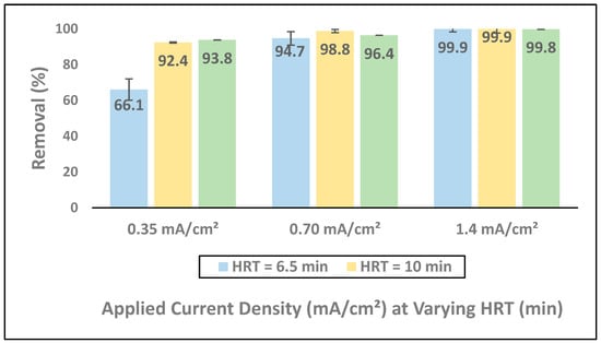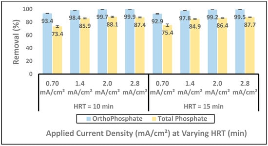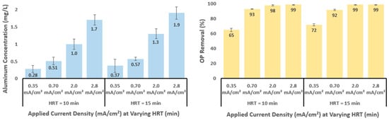 The removal efficiency of phosphorus is governed by a combination of electrochemical and adsorption mechanisms. The effect of applied current densities and HRTs on OP removal was investigated. For this, an influent concentration of 19.45 ± 0.838 mg/L OP was used. The results are shown in Figure 3. It is clearly seen that 99.8% removal was achieved with a 15 min HRT, undergoing an applied current density of 1.4 mA/cm2. Over 96% removal was achieved with the same treatment time but half the applied current. This indicates that applied current density governs OP removal, which is demonstrated by the minimal removal variance when altering HRT under the same applied current density. Additionally, an applied current density of 0.35 mA/cm2 coupled with an HRT of 6.5 min provided significantly lower removal compared to the other tests. However, the same current density coupled with 10 and 15 min HRTs provided a significant removal increase, suggesting that the short treatment time was the cause of inadequate OP removal. Figure 3 also shows the trend that increasing current density will increase OP removal efficiency, which corresponds with other studies [19].