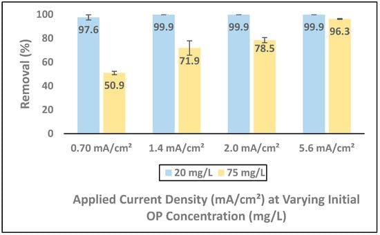 Effect of applied current densities and HRTs on OP removal at high OP concentration.