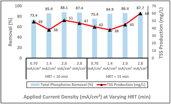 Hydraulic retention time (HRT) plays a critical role by providing sufficient contact time for coagulant formation, phosphorus adsorption, and PP hydrolysis. These findings suggest that the interplay between current density and HRT is vital for balancing removal efficiency and operational cost, particularly in achieving optimal TP removal.