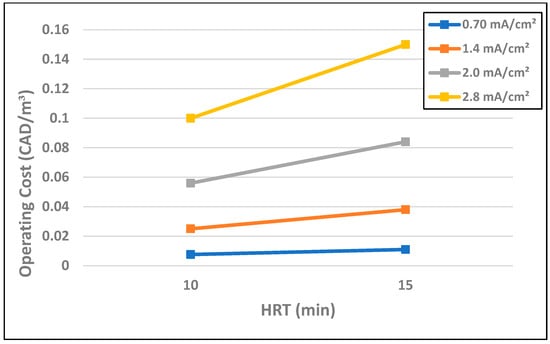 It is clearly seen that an increase in operation cost is associated with increasing the applied current density and also increasing HRT at any given applied current density. The treatment cost for 1 m3 of wastewater ranges from CAD 0.0076 to CAD 0.15, representing the minimum and maximum operating conditions tested. As stated previously, optimal conditions for TP removal over the range of values tested appear to be using a current density of 2.0 mA/cm2 and an HRT of 10 min, which represents a cost of CAD 0.056/m3. However, a balanced condition that considers both phosphorous removal and cost, thereby satisfying both requirements, ought to be addressed. For example, operating the EC reactor at a current density of 1.4 mA/cm2 and an HRT of 10 min would achieve 85.9% OP removal (a reduction of only 2.2% from the optimum condition); however, it would reduce the operating cost by 55% (from CAD 0.056/m3 to CAD 0.025/m3).