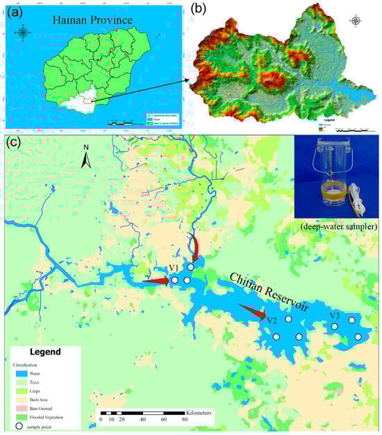 (a) Sampling sites location map, (b) Sampling sites Digital Elevation Model (DEM) map, (c) Distribution of sampling sites in the Chitian Reservoir. V1, V2, and V3 represent the strong, moderate, and weak hydrodynamic force regions, respectively. The red arrow indicates the direction of water flows. Embedded image is water sampler.
