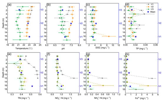 Vertical profiles of temperature (a), pH (b), DOC (c), TP (d), TN (e), NO3−–N (f), NH4+–N (g) and Fe2+ (h) across different hydrodynamic regions. The “★” symbol indicates the mean value of water column samples under different hydrodynamic forces.