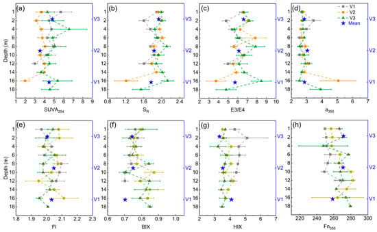 Vertical profiles of DOM spectral indices across different hydrodynamic regions (V1, V2, and V3). SUVA254 (a), SR (b), E3/E4 (c), a355 (d), FI (e), BIX (f), HIX (g), and Fn355 (h). The “★” symbol denotes the mean value of water column samples within each different hydrodynamic region.