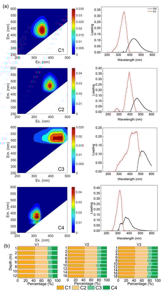 PARAFAC analysis successfully decomposed all DOM samples into four fluorescent components (Figure 4a), i.e., humic-like substances originating from different sources (Table 2). Specifically, component 1 (C1), component 2 (C2), and component 3 (C3) are of terrestrial origin, and component 4 (C4) is of microbial origin. As depicted in Figure 4b, the DOM in the Chitian Reservoir, located in a tropical region, comprises humic-like substances without the presence of protein-like substances, including three terrestrial sources (C1, C2, and C3) and one microbial source (C4). This phenomenon aligns with the results obtained by Zhang et al. []. The high temperature, intense illumination, and strong microbial metabolism of the Chitian Reservoir in tropical region may contribute to this phenomenon. Yuan et al. [] suggested that high-temperature reservoir water can enhance the release of humic substances, whereas proteins-like substances are unstable components of DOM, which are easily degraded by microorganisms []. The combined percentages of the three terrestrial humic-like components ranged from 85.38% to 87.03% (Figure 4), indicating a predominantly allochthonous sources. As hydrodynamic force decreases, the total percentages of components C1, C2, and C3 decrease from 87.03% to 85.38%. In comparison, the microbial humic-like component (C4) percentage increases from 12.97% to 14.62%, indicating increased microbial activity. This is ascribed to the fact that weaker hydrodynamic regions with longer water retention time facilitate higher microbial metabolism []. This trend aligns with the variation observed in the BIX index (Figure 3b). Interestingly, the vertical distribution of these two groups of fluorescent components (terrestrial and microbial source groups) varies across different hydrodynamic force regions. In the strong hydrodynamic force region (V1), the C4 percentage decreases with depth, whereas in the moderate and weak hydrodynamic force regions (V2 and V3), the C4 percentage increases with depth.