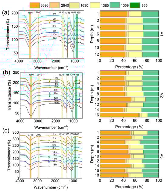 FT-IR spectral characteristics and the relative abundance of high absorption peaks of water column DOM, strong hydrodynamic forces in the V1 region (a), moderate hydrodynamic forces in the V2 region (b), and weak hydrodynamic forces in the V3 region (c).