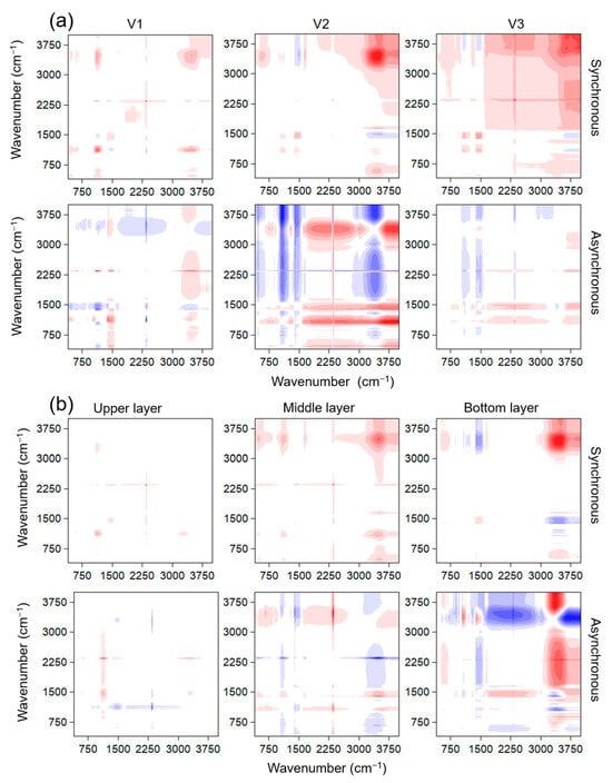Synchronous and asynchronous maps of water column DOM samples under strong (V1), moderate (V2), and weak (V3) hydrodynamic forces (a). Synchronous and asynchronous maps of water DOM samples under different hydrodynamic forces at the same upper, middle, and bottom layers (b). In the 2D-COS maps, cross-peaks located in the bottom-right corner were analyzed. Red and blue colors represent the positive and negative correlations, respectively.