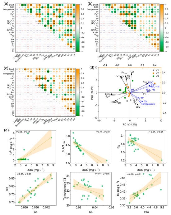 Pearson correlation analysis of water physicochemical parameters and DOM spectral characteristics under strong (a), moderate (b), and weak (c) hydrodynamic forces. Principal component analysis of all water physicochemical and DOM spectral parameters (d). Relationships between two parameters (e). The orange-shaded area color indicates 95% confidence intervals. * p ≤ 0.05; ** p ≤ 0.01. Green dots are samples, Red line is the fitting line.