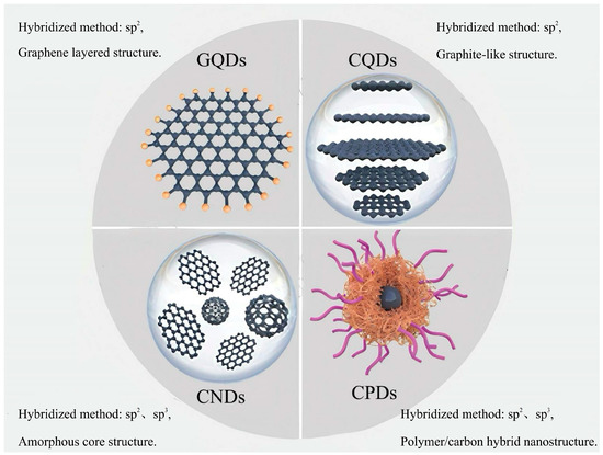 Due to the diversity of carbon sources and synthesis methods for CDs, there are a wide variety of CDs, making it difficult to define and classify them accurately. Currently, based on the different structures of the carbon core, CDs (Figure 1) can be divided into graphene quantum dots (GQDs), carbon quantum dots (CQDs), carbon nanodots (CNDs), and carbonized polymer dots (CPDs) [32].