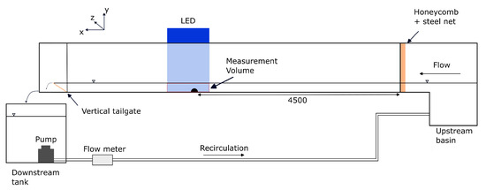 Experiments were carried out in a recirculating open-channel flume in the John Field Laboratory at Luleå University of Technology. The flume, shown in Figure 1, is 7.5 m long, 0.3 m wide, and 0.3 m high. It provides optical access through the side walls and has an adjustable slope. A pump located in a downstream tank is used to recirculate the water while the flow rate is controlled through a KROHNE OPTIFLUX electromagnetic flow meter with an accuracy of ±0.7%.