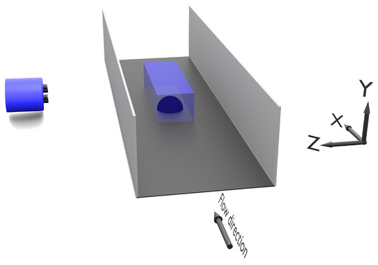 Images were acquired in a measurement volume for the single case starting at x = −65 mm and for the double case starting at x = −112.5 mm, with a size of 300 × 75 × 100 mm3, and at a camera working distance of 400 mm from the centerline of the flume, shown in Figure 2. In total, 4000 single-frame images were captured at 150 Hz and 200 Hz for the higher and lower RS, respectively. The acquisition rates were selected to ensure similar particle displacement. The average seeding density was approximately 0.01 particles per pixel.