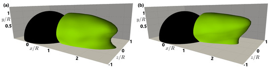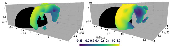 Recirculation zone (highlighted in green) in the near wake behind the single hemisphere with isosurfaces of = 0 at different submergences (a) h/R = 2 and (b) h/R = 1.5.