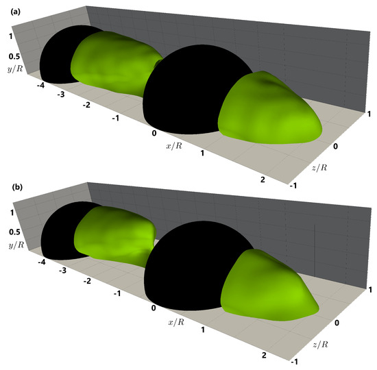 Recirculation zones (highlighted in green) in the near wake behind the hemisphere for the double hemisphere case with isosurfaces of = 0 at different submergences (a) for h/R = 2 (b) for h/R = 1.5.