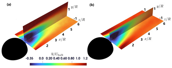 Distribution of time-averaged dimensionless streamwise velocity behind the single hemisphere for two different submergences (a) h/R = 2 and (b) h/R = 1.5.