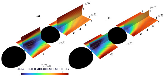 Distribution of time-averaged dimensionless streamwise velocity behind the hemispheres for the double hemisphere case, for two different submergences (a) h/R = 2 and (b) h/R = 1.5.