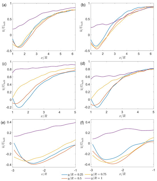 Horizontal velocity profiles of time-averaged dimensionless streamwise velocity for both submergences: (a) downstream the single hemisphere for h/R = 2, (b) downstream the single hemisphere for h/R = 1.5, (c) downstream the double hemispheres for h/R = 2, (d) downstream the double hemispheres for h/R = 1.5, (e) downstream the first hemisphere for double hemisphere for h/R = 2, (f) downstream the first hemisphere for double hemisphere for h/R = 1.5.