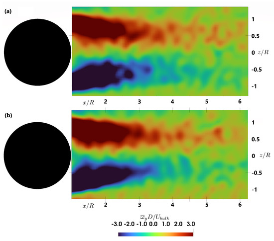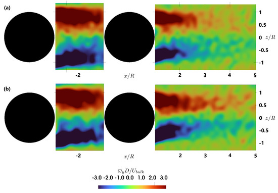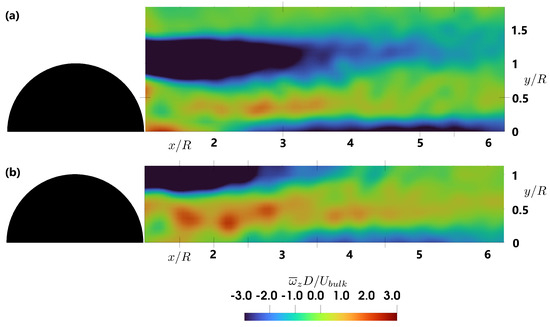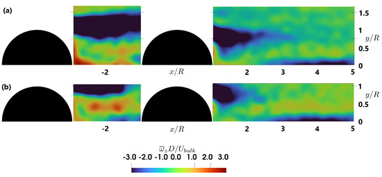 Distribution of time-averaged dimensionless vertical vorticity behind the hemispheres for the double hemisphere case, for two different submergence at y/R = 0.5 (a) h/R = 2 and (b) h/R = 1.5.