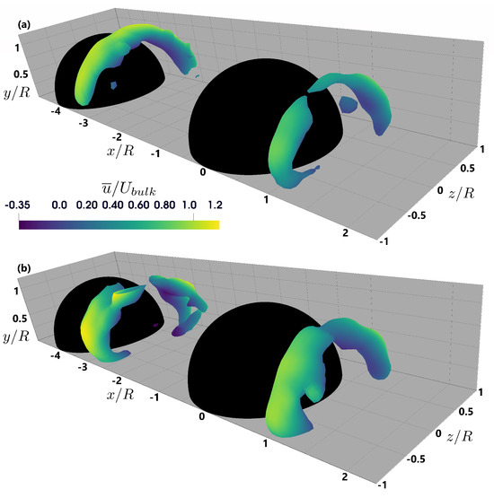 The isosurface of = 0 in Figure 3 and Figure 4 represents the recirculation zone for each of the two RS. The submerged hemisphere produces a wake that exhibits complex three-dimensional separation, with variations in recirculation length and width depending on the RS. A lower RS produces a narrower wake, while a higher RS leads to a more extended and uniform recirculation region (Figure 3). For the single case at the lower submergence, the recirculation length decreased by approximately 16% at and by 6% at compared to the higher submergence. Furthermore, the spanwise width of the recirculation zone decreased by 17% at , close to the hemisphere, for the lower RS (see Table 2). A small change in the shape of the recirculation zone behind the downstream hemisphere in the case with double hemispheres is visible in Figure 4. The recirculation zone extends the entire length between the hemispheres for the larger RS, creating an isolated reversed flow region. For the lower submergence, the recirculation between the hemispheres resembles the single hemisphere case but extends downstream with a narrow width and a height of y/R ≈ 0.15. A shorter and narrower recirculation zone results from a more rapid reattachment downstream of the single hemisphere at lower RS due to the obstacle’s increased relative influence on the flow. The higher RS results in a stable, isolated recirculation zone in the gap, since the greater flow depth reduces interactions between the hemispheres.