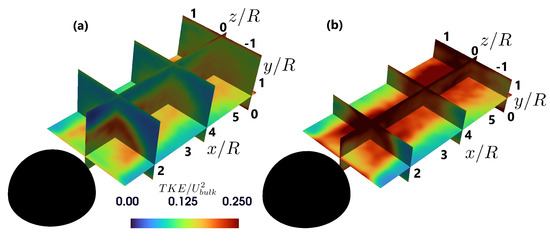 Distribution of time-averaged TKE/ behind the single hemisphere for two different submergences (a) h/R = 2 and (b) h/R = 1.5.
