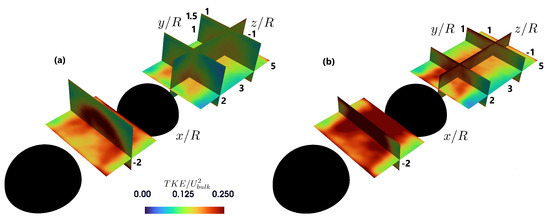 Distribution of time-averaged TKE/ behind the hemispheres for the double hemisphere case, for two different submergences (a) h/R = 2 and (b) h/R = 1.5.