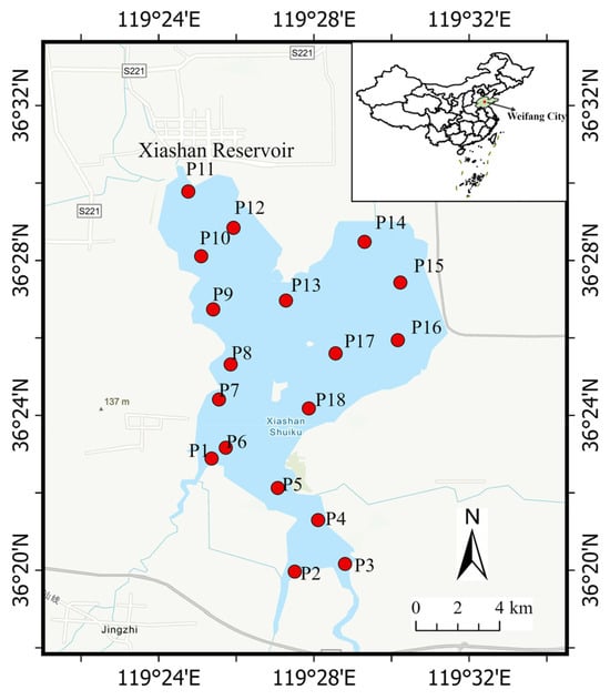 Location of Xiashan reservoir in Weifang City, northern China, and sampling points (red cycles).