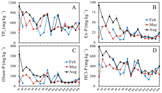 Similar to TPS, the contents of Ex-P, Olsen-P, and HCl-P were significantly higher in August than in February and May (Table 1; Figure 2B–D). Mean values for Ex-P, Olsen-P, and HCl-P ranged from 19 mg kg−1, 58 mg kg−1, and 327 mg kg−1 in May to 35 mg kg−1, 101 mg kg−1, and 444 mg kg−1 in August, respectively (Table 1). The seasonal differences in these P indexes were more pronounced at points near river entrances (P1–P4) than at the other points, where the contents of Ex-P, Olsen-P, and HCl-P were relatively consistent (Figure 2B–D).