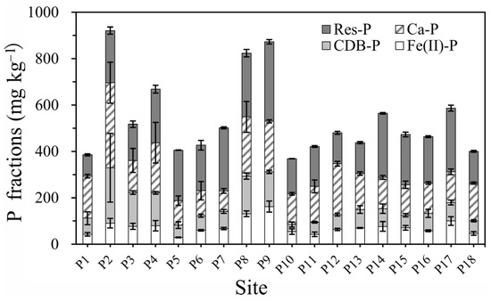 Variations in the P fractions in surface sediments. Samples were from May 2022. Fe(II)-P: sum of labile exchangeable P and P precipitated by ferrous iron; CDB-P: P bound by iron/aluminum oxides; Ca-P: P bound by detrital and metastable apatite; Res-P: residual organic P. Values are means of 3 replicated measurements. Error bars represent standard deviation.